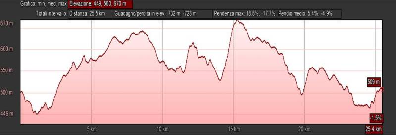 Si parte da Montepulciano in direzione degli impianti sportivi oltrepassati i quali si va a dx su sterrata segnalata in gradevole saliscendi.per circa 1km e mezzo. Si abbandona la sterrata principale che risale verso il bivio di S.Biagio per piegare a sx sempre su sterro in corrispondenza dell’agriturismo ardene si svolta a dx in salita su stradello di campo che costeggia un susineto e che ci porta in breve all’asfaltata che collega chianciano a Montepulciano; la si attraversa in direzione della zona artigianale totona e ad un bivio proseguiamo dritto su asfalto in ripida salita seguiamo la strada asfaltata fino a che non scende a dx e appena oltrepassato un podere si piega a sx su stradello di campo (sbarra ) si prosegue su falsopiano fino ad un podere abbandonato ( sbarra ) dove si va a sx in decisa e sconnessa discesa. Giunti a fondovalle si risale faticosamente la collina fino ad entrare in un bosco dopo circa 300m si arriva ad una biforcazione dove si va a sx ancora in ripida salita. Una volta usciti dal bosco la strada spiana concedendoci un po di fiato e dei bellissimi scorci panoramici; si supera villa pianoia e si prosegue sulla strada fattasi ora sterrata che ci porta ad una asfaltata che va presa a sx dopo uno strappetto al primo incrocio si va a dx in direzione eremo della Maddalena che raggiungiamo dopo aver girato a sx ad un edificio e percorso un’ampia sterrata in salita in mezzo al bosco. Una volta raggiunto l’eremo si consiglia una visita per l’incomparabile bellezza del luogo; la traccia prosegue costeggiando su mulattiera le mura del convento per poi immettersi a sx su un’altra mulattiera inizialmente molto sassosa si prosegue in mezzo al bosco in ambiente fiabesco tralasciando una prima deviazione a dx e andando a dx ad una successiva; il sentiero risale il bosco e ad uno slargo si prosegue dritto in discesa poi piu’avanti si va ancora a dx poi a sx in discesa uscendo dalla sentieristica e ci immettiamo a sx su ampia sterrata in discesa prima leggera poi ripida. Dopo aver oltrepassato una villa ad una curva a sx giriamo a dx aggirando un podere e dopo aver oltrepassato una sbarra proseguiamo in decisa discesa fino a fondovalle si risale la collina con qualche duro strappo fino ad entrare nel bosco ed uscirne 1km circa piu’avanti dopo dei bei saliscendi costeggiamo il podere montauto con bel panorama sul Castelluccio e la riserva nat.di pietraporciana fino ad arrivare ad una sterrata che si segue a dx in salita prima e saliscendi poi. Arriviamo all’asfaltata in loc.Pianoia che avevamo gia’percorso in precedenza, ma rispetto a prima tralasciamo la deviazione per l’eremo proseguendo sull’asfaltata che dopo circa 3 km di discesa e falsopiano ci porta al bivio di villa bianca andiamo a sx e arriviamo in breve al bivio di s.biagio. si prosegue a dritto su viale con cipressi raggiungendo il tempio che aggiriamo a sx prendendo via dei canneti che seguiamo fino in fondo. Una volta passati sotto 2 ponti allo stop si va a dx raggiungendo dopo 700m circa il punto di partenza.