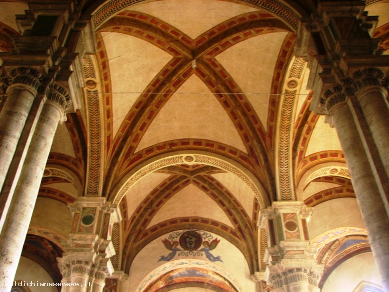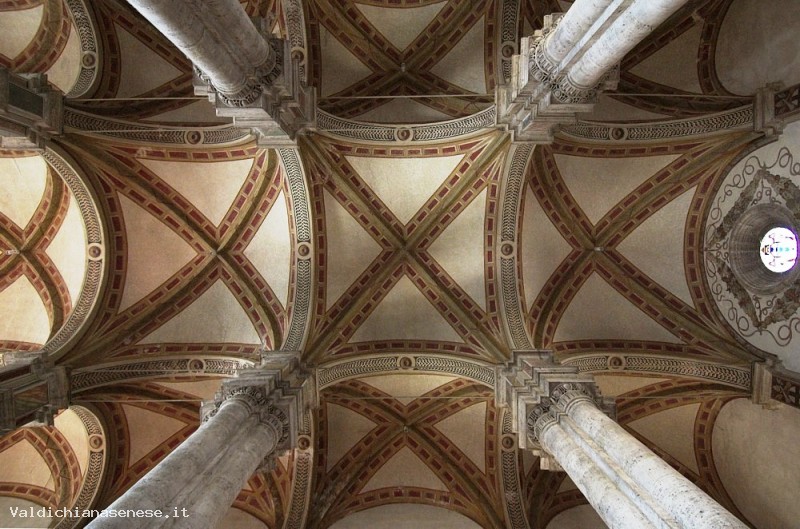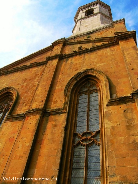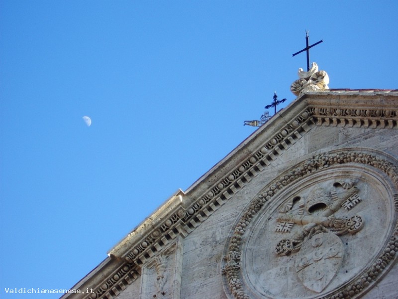 It was built by Rossellino in 1459. Dedicated to the Assumption, it was constructed on the ruins of the ancient Romanesque parish of Saint Mary. In order to have a large nave and a fairly large square, the apsis was anchored to the back of the hill, but not firmly enough to render it resistant on the unstable damp ground . As a matter of fact the restoring works on the sprone of the building that looks out on the countryside, have been very difficult and they’ve taken a long time. The exterior, clearly influenced by the architect Alberti, has a travertine facade, opened by three portals and divided in three sections by large pilasters flanked by two files of columns with a rose window and crowned by a tympanum with the code of arms of Pius II in the center. The bright interior, made up of three naves, similar in height, that Pius II had admired during his voyages in Northern Europe, links itself to Gothic motifs with the long and slender bundle pillars surmounted by tall imposts, on which stand the Gothic vaults. The ray apsis is lighted by the round windows, ornamented with thorny arabesque motifs. The bell tower with an octagonal plan, stands over the ancient crypt, it juts out on the left of the church and protrudes itself towards the sky ending with a beautiful gable. Among the artworks inside the Cathedral, we’d like to point out some altar panels, all similar in size and realized especially for the Cathedral , between 1461 and 1463, by some of the major Sienese artists of the time. The crypt houses sculpture fragments from the pre existing Romanesque Church of Saint Mary and a baptismal font by Rossellino’s shop.