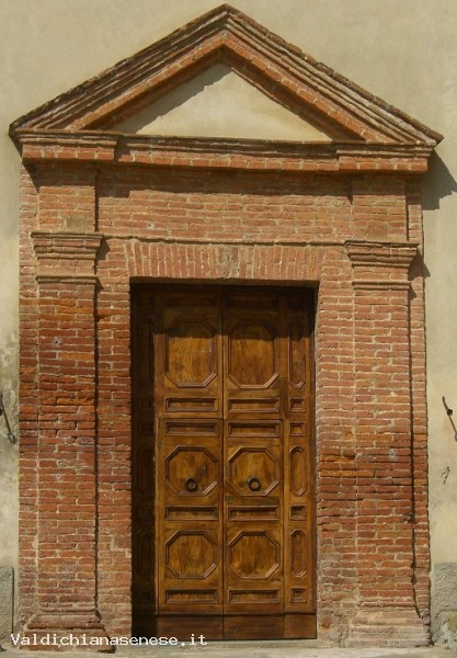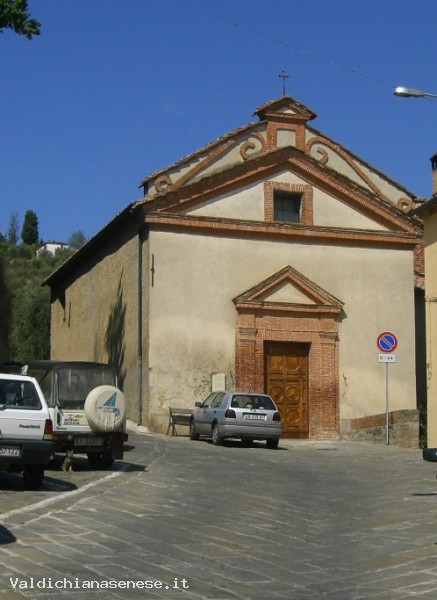 The plaster facade emphasizes the brick decorations, highlighted by three triangular spandrels, from which spring out from the lower part two segments that terminate with volutes. The interior is made up of a single space with a semi circular arch on the back wall, supported by two columns with Ionic capitals; the choir behind the arch follows its design with a barrel vault. Among the many paintings, the following stand out : “ The Annunciation “ by Santi di Tito (XVIth century), “The Ressurection” by XVIIth century Florentine School, “ The Madonna of the Rosary with Saints” attributed to Rutilio Manetti (XVIIth century), “The Grieving Madonna with Saints” by the sphere of Ventura Salimbeni (XVIIth century) and a good reproduction of “The Madonna of the Cup” by Correggio, realized at the end of the XVIIth century.