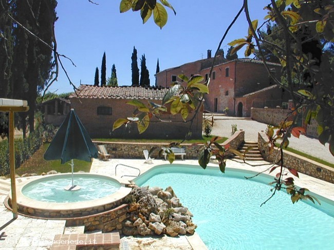 Inoltre la struttura dispone di un'ampia piscina di 12 mt per 7mt, con adiacente una vasca idromassaggio. Il tutto immerso nella tranquillità delle colline senesi, circondate da vigneti di uve D.O.C.G., oliveti e boschi con piante secolari.