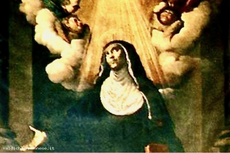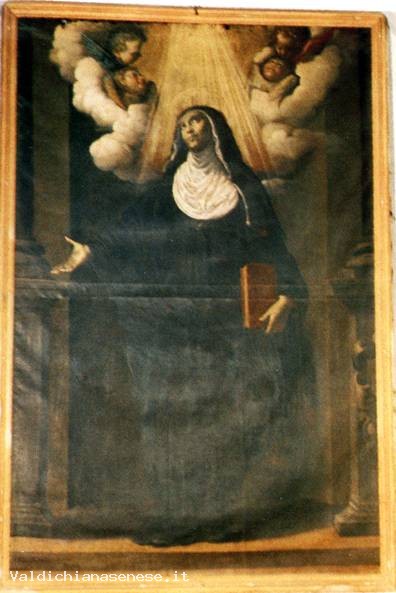 La tela, attualmente posta sul secondo altare di destra della chie¬sa, sembra costituire un'importante testimonianza della collabora¬zione tra Rutilio ed il giovane figlio Domenico nel momento in cui l'anziano pittore rinsalda, probabilmente a contatto con esempi del Barburen, con nuovo vigore l'adesione ai modelli naturali, alla cruda verità ottica dei modelli caravaggeschi, espressa del resto a pieno nella tela eseguita, in anni non lontani da questa Santa Monica, per un'altra chiesa ascianese, quella di San Francesco.