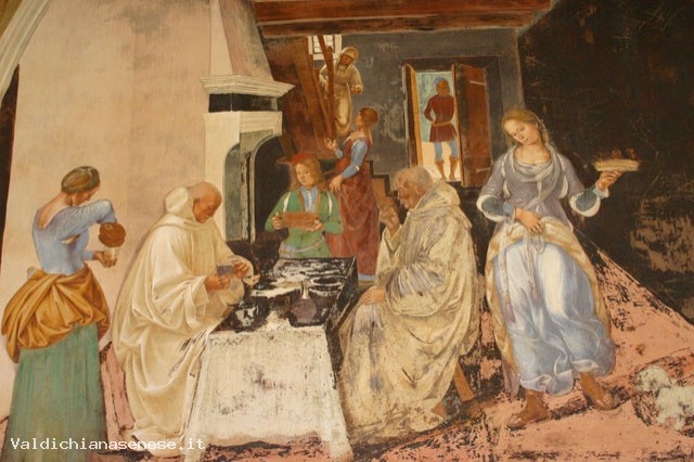 In the scene we see two monks intent to consume a pastoall'interno of an inn and in the background, Benedict scolds them for violating the Rule. This is probably the most successful of the pictorial scene. Inside the inn, you will see two comely maids, serving the two monks, visibly pleased with their illegal dinner. A boy advance careful not to spill the contents of a container filled with soup. Two other women in the background are busy in their chores, like a true Italian cuisine era. Against the door ajar you can see a young shoulders portrait in backlight, typically feature signorelliana.
