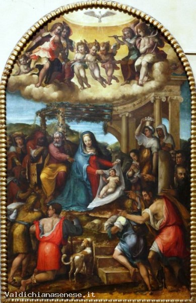 The painting, started by Riccio and concluded by Arcangelo Salimbeni, stood over the altar dedicated to the Nativity of Jesus, mind today is hanging on the right wall of the church. The scene is the arrival of the shepherds in Bethlehem after the angel announced the birth of their Savior Jesus Christ In the painting the gesture of the Virgin that lifts the veil white highlights the body of Christ. At the top you can see the work the Holy Spirit, in the form of a dove, comes on the Child, whose nakedness shows that He is true man as well as true God The backdrop to the scene a classic building in ruins, the symbol of the ancient Roman world is going to end, in contrast to the vitality of the child Jesus, who instead represents the Christian world about to be born.