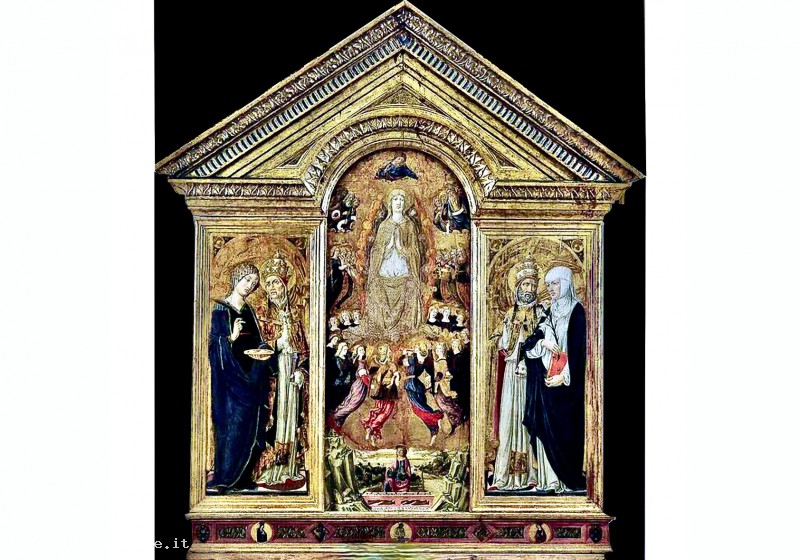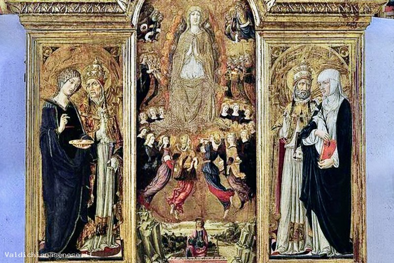 This large work (257 × 211 cm), structured like a triptych, is topped by a sloping roof resembling a small temple. Commissioned directly from Vecchietta by Pope Pius II Piccolomini, the triptych is considered the most important of the works created by the great Sienese painter and sculptor.