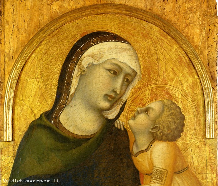 The extraordinary work, the central part of a polyptych, depicts the Madonna with the child with extreme elegance, tenderly abandoned on the mother's arm and with the head in profile tilted backwards, it seems to seek its gaze in a sweet and delicate motion of affection. In this masterpiece of Sienese painting Pietro Lorenzetti has now assimilated the novelties introduced by the painting of Duccio di Buoninsegna and has acquired Giotto's teachings with extreme enthusiasm.