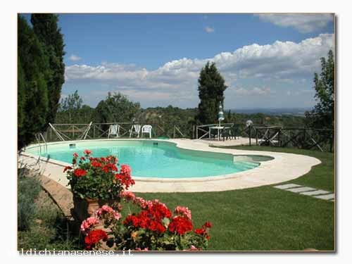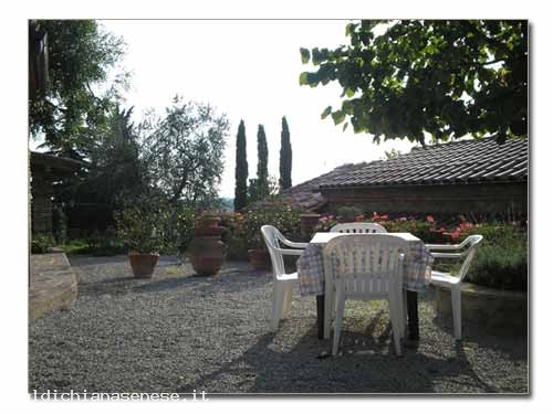 Among the beautiful hills which divide the area of Val di Chiana Aretina from the Senese area it's possible to discover very fine agritourisms and farmhouses for holidays: Poggio al Vento is one of these. Poggio al Vento is an old farmhouse composed of a country house divided into three nice apartments and two haylofts renovated and become two nice little houses. In front of the apartments we can find a large green relax space surrounded by Cypresses and Olive trees and a coin with barbecue and a beautiful swimming-pool. For its central position it's easy to reach a lot of important and characteristic places of this area as Siena, Arezzo, Florence and other villages in the heart of the Crete Senesi. We suggest the wine tasting and trips to Rapolano,famous for its Thermal Baths, the abbaye of Monte Oliveto Maggiore and so on.