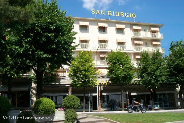 Al centro della stazione termale di Chianciano Terme, affacciato sulla Val di Chiana, equidistante i principali stabilimenti termali, nel centralissimo Viale della Libertà, sorge l’Albergo San Giorgio. Gestito fin dal 1950 direttamente e personalmente dai proprietari, attualmente alla terza generazione. Luca e Ilaria, con il piccolo Edoardo, vivono e lavorano all'interno dell'hotel. L’albergo unisce alla proverbiale buona cucina e inappuntabile trattamento tutta una serie di servizi innovativi che lo distinguono. Il ristorante dell' hotel utilizza solo prodotti dalla qualità impeccabile ed ove possibile quelli dell'azienda agricola dei proprietari. L'hotel è dotato di sale massaggi con personale specializzato, trattamenti di bellezza, gabinetto di agopuntura, vasca multipersona ad idromassaggio (minipiscina) con acqua a 37°. A disposizione dei clienti, ampie sale di soggiorno e tv ed una meravigliosa terrazza giardino di oltre 250 mq affacciata sulla splendida Val di Chiana. E' inoltre presente un attrezzato bar interno all' hotel. Sono altresì disponibili garage e parcheggio. Recentemente ristrutturato, l'albergo risponde ai più moderni criteri estetici e funzionali, con tocchi di anticonformismo che lo differenziano. Le camere da letto, dotate di tutti i confort faranno da cornice alle vostre vacanze o alle vostre cure termali, migliorando la sensazione di benessere che ne riceverete .