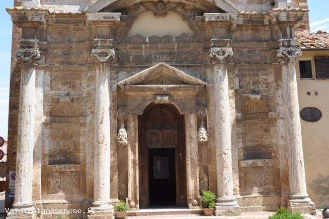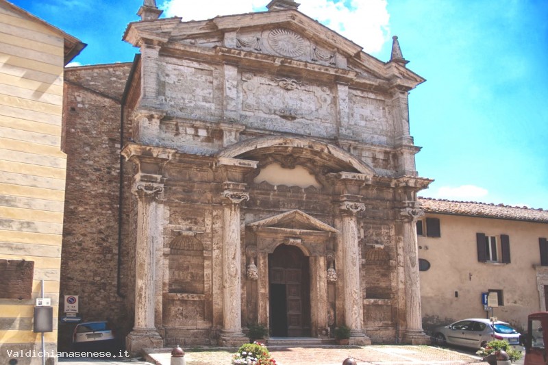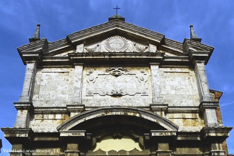 The plan of the church, that was built in 1653 ,is attributed to Flaminio del Turco. The fancy travertine facade , divided in two sections, that are in turn divided in three parts, unites structural styles and Late Mannerism decorations in a composite exuberance ,typical of Roman Baroque. Especially theatrical is the portal, framed by columns with Ionic festooned capitals. Their jambs are decorated with curled spirals from which hang large fruit pendants. The one nave interior, hosts a wooden Crucifix by Giovan Battista Alessi, Saint Girolamo, Saint Margaret, Saint Lawrence, Saint Agnese by Gaetano Perpignani and a Madonna with Child by Luca Signorelli. Underneath the present church, there are traces of a building that dates back to the XIIth century.