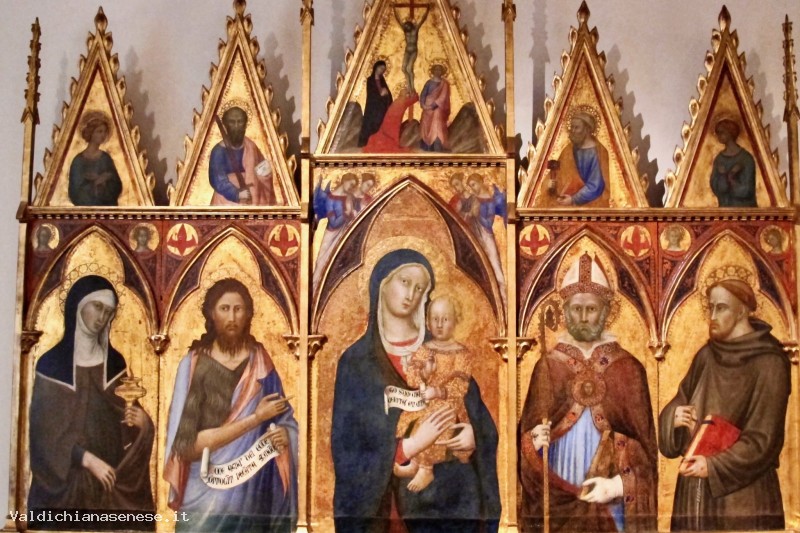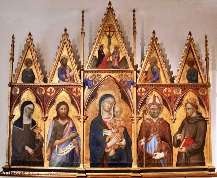 If present separately in due fasce: in whatla inferiore, di maggiorii proporzioni, troviamo al centro la Vergine con en braccio il Bambino. Ai suoi lati scopriamo, a sinistra, santa Chiara e san Giovanni Battista mentre, a destra, ci sono le immagini di sant'Agostino e san Francesco d'Assisi. nella fascia superiore, composta da cuspidi, si scopre nella scene centrale la scene del Cristo crocifisso con ai piedi della croce le figure della Madonna, di San Giovanni Evangelista e della Santa Maria Maddalena. The other parts of the picture will sound a little more difficult to interpret. Agostino vi è dipinto come vescovo e Dottore della Chiesa: in testa carried the mitra, indossa il piviale e con la mano destra impugna il bastone pastorale. With the sinister hand she brought a red book to her pet. On his face, abbellito da folta barba riccioluta, ha un aspetto stereotipato, tipico della pictura del secolo.