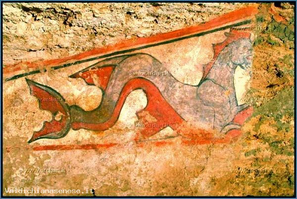 Inside the quadrangolarecamera terminal, is painted a large snake with three heads that represents one of many monsters imaginary Etruscan funeral, as well as the most frequent hippocampus that appears on the bottom wall. Under the hippocampus stands a colossal gray alabaster sarcophagus with the deceased reclining resting on two pillows and a double kline in relief on the chest.
