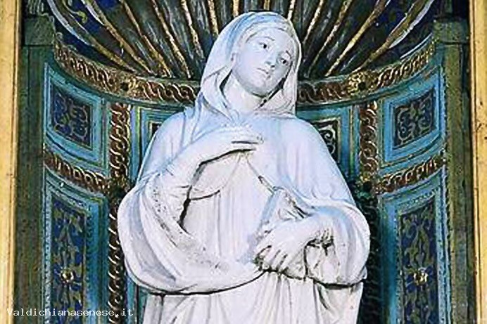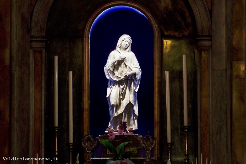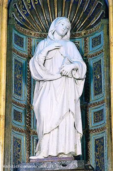 La statua è situata in una nicchia in legno intagliato, dipinto e dorato. Dalla bibliografia risulta un restauro eseguito nel 1779 da un non meglio identificato Maestro Giocondo di Siena. Lo stemma ricorda molto da vicino quello adottato dalla famiglia Borghesi ai primi del Cinquecento; sono però del tutto diversi gli smalti, ed è quindi impossibile una corretta identificazione.