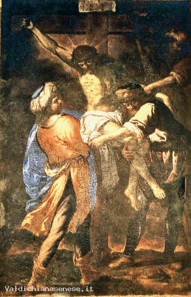 Olio su tela, 240x155 cm. Ricordata dal Romagnoli, prima del 1835, nell'oratorio di Santa Croce, dove trent'anni dopo la segnalò anche il Brogi, come opera di Francesco Nasini, la tela, che sostituì, probabilmente nel corso dell'Ottocento, la Crocifissione del Mei, appare rifarsi agli esemplari più acutamente naturalistici di Rutilio Manetti, modelli ai quali Francesco guardò con precipuo interesse nella sua fase giova¬nile. L'attribuzione al Nasini, che ad Asciano affrescò le lunette con le Storie della Passione proprio in Santa Croce e per San Francesco eseguì una tela con la Crocefissione, potrà essere verificata nel corso dell'intervento di restauro già programmato dalla Soprintendenza di Siena. Descrizione a cura di Cecilia Alessi (1994).