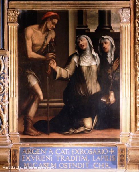 It is one of the three great scenes in the oratory of the kitchen of the Sanctuary of St. Catherine, is home to a wall flanked by two paintings done by Riccio shortly before his death and perhaps supplemented by Arcangelo Salimbeni. The left depicts Jesus holding out to Catherine the cross which the Holy had given us as a beggar
