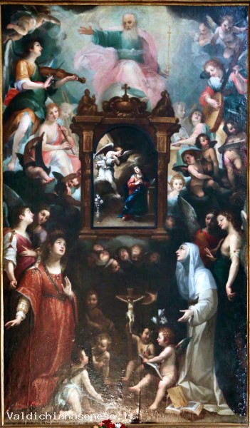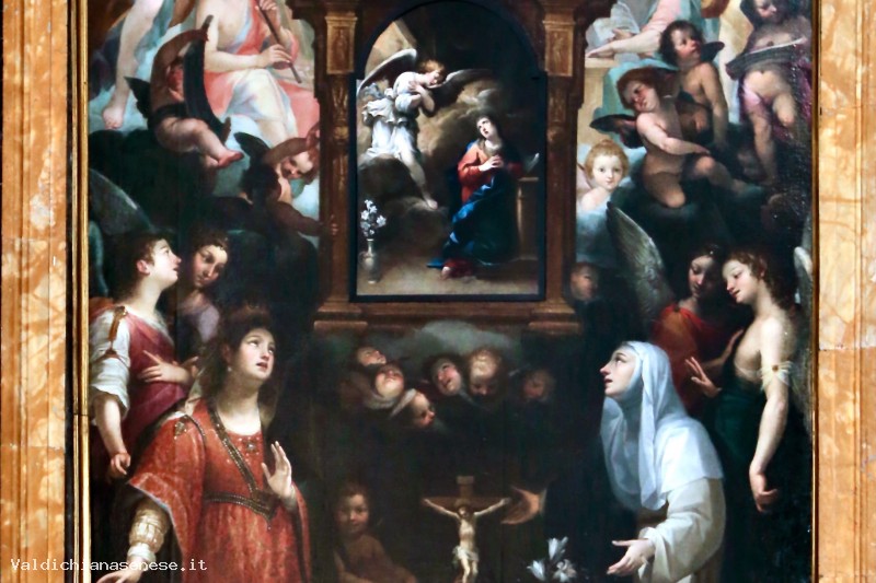 At the center of the painting is a tabernacle containing a small panel depicting the "Annunciation." This painting dates from after the 17th century and is the work of a pupil of Raffaello Vanni, a certain Manenti. It is a copy of Raffaello Vanni's "Annunciation," preserved in the Cathedral of San Cerbone in Massa Marittima.
