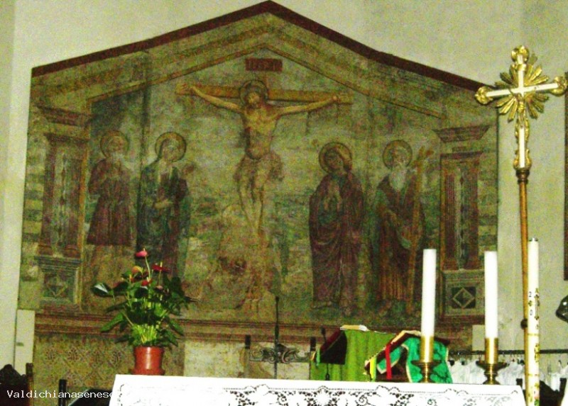 la parte centrale rappresenta la "Crocifissione" con ai lati la "Madonna e i Santi Girolamo, Giovanni, Andrea e Maria Maddalena"; in basso è rappresentato l' "Ecce Homo"; sulla sinistra è stata posta la "Madonna che allatta il Bambino", mentre sulla destra è l'effigie di "San Sebastiano". Nel transetto sinistro è collocata la lunetta lignea con la "Madonna col Bambino" di Taddeo di Bartolo.